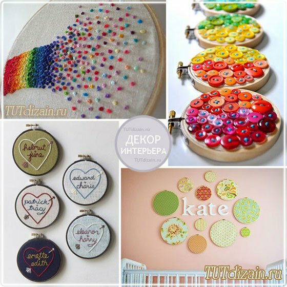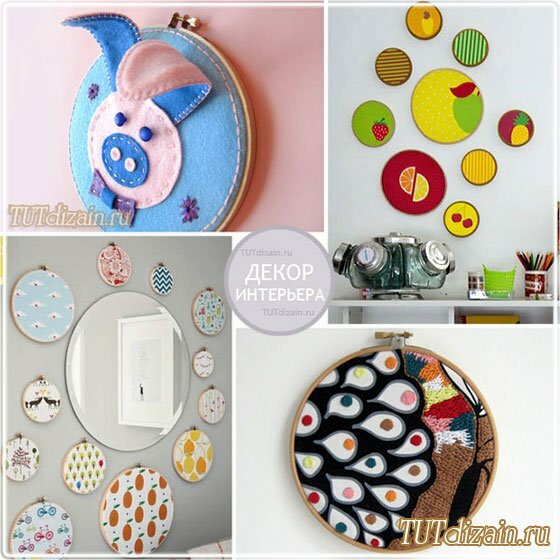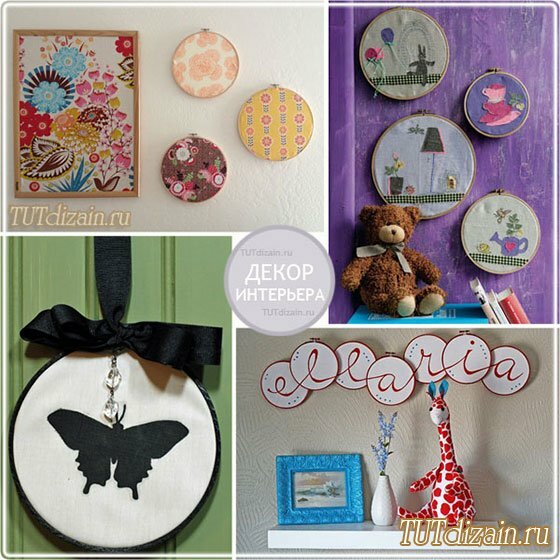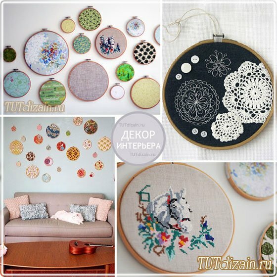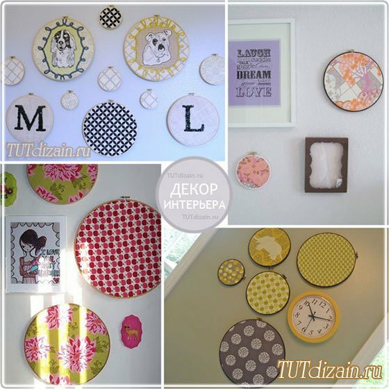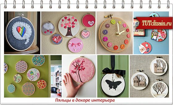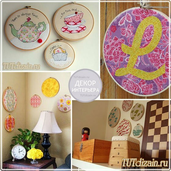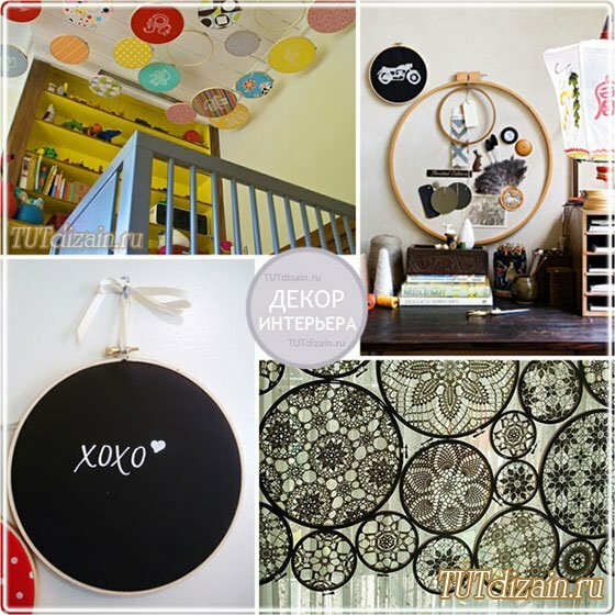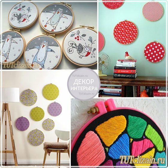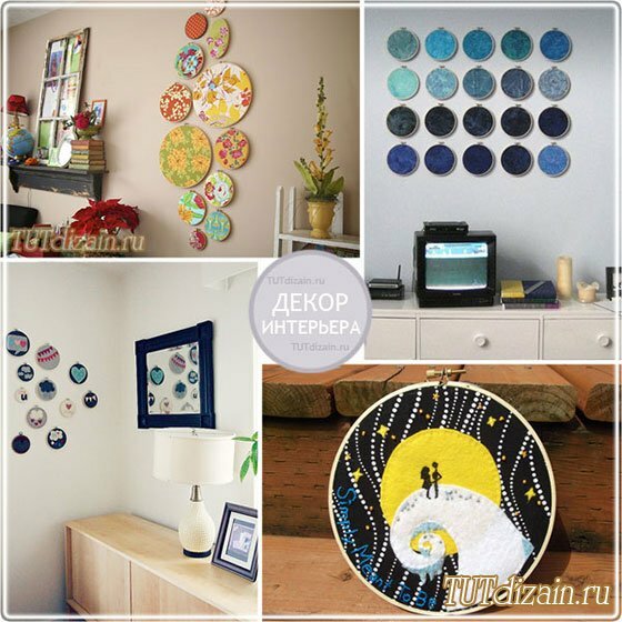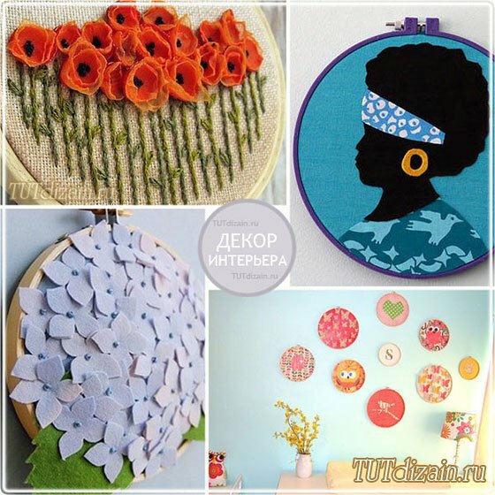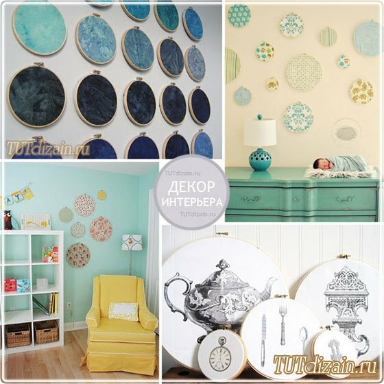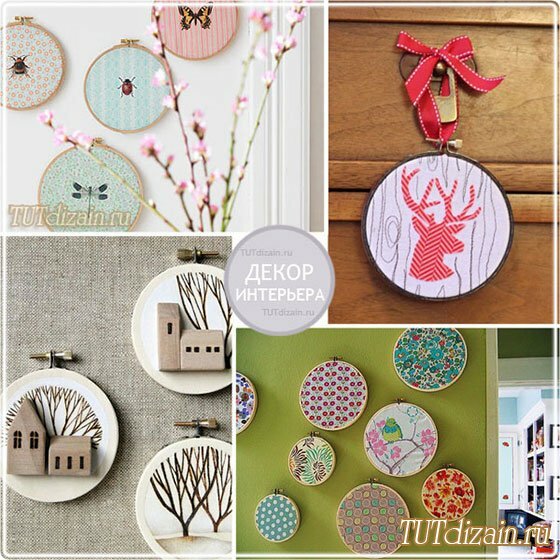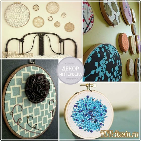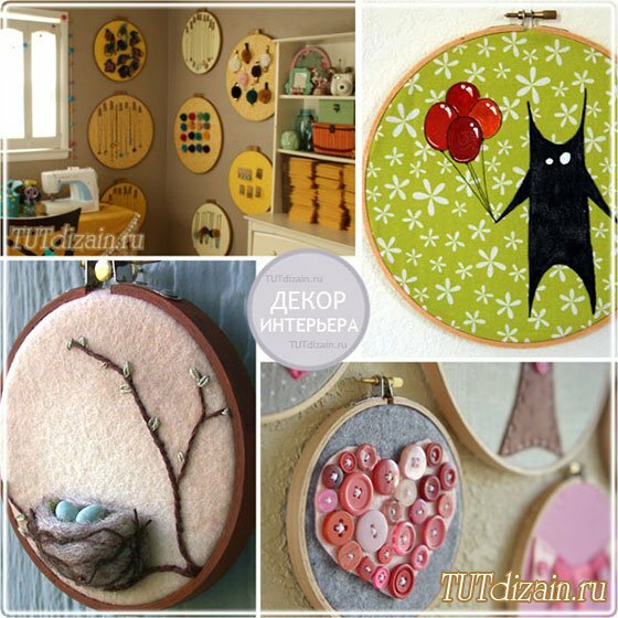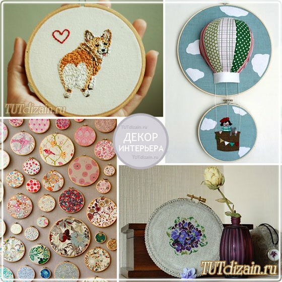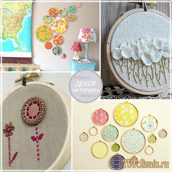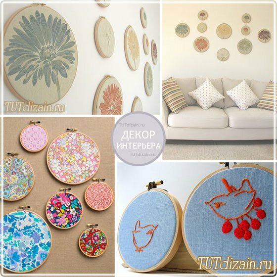 Идеи использования пяльцев в декор пришли к нам из Европы, где рукодельницам пришло в голову сделать их рамками для тканевых картин. Данная идея приобрела должную популярность, и новым веянием в мире дизайна стало оформление комнаты при помощи нескольких пяльцев. Можно выбирать несколько обручей одинаковых размеров или собирать несколько пяльцев разных размеров и составлять из них композиции, которые могут быть выполнены в разных стилях, при помощи любой техники и может украсить любое помещение.
