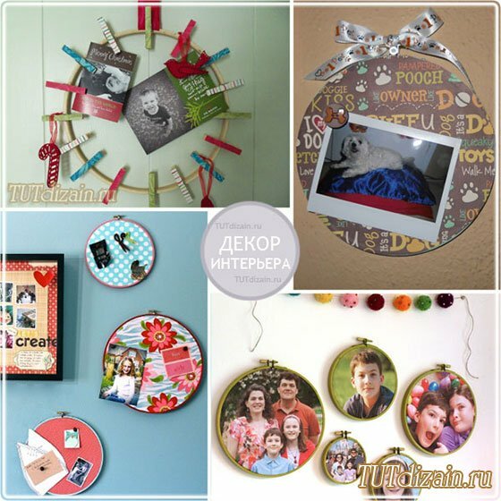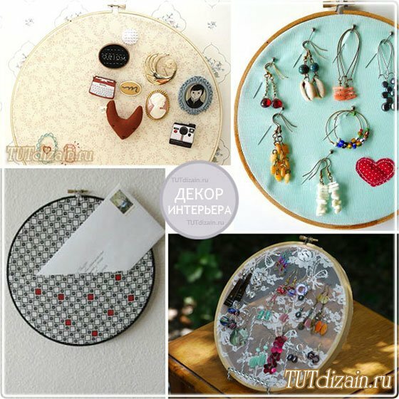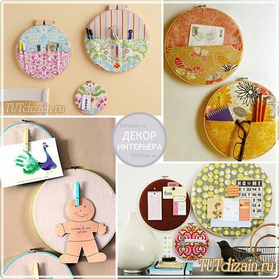 Также пяльцы могут быть использованы в качестве доски напоминаний, панно стильных часиков или вместо фоторамки.