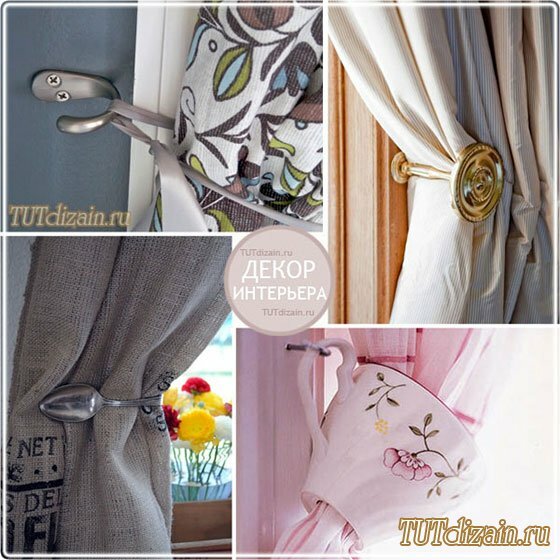 ![]() Также в качестве подхватов для штор можно использовать различные предметы, к примеру, старые металлические дверные ручки, которые можно устанавливать над окном/на стене, подчеркивая всю декоративность данного элемента. Используйте подходящие к интерьеру различные вешалки в виде крючков (можно их использовать с различными рисунками).