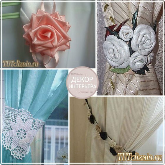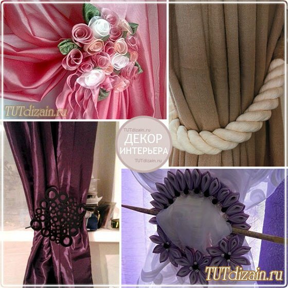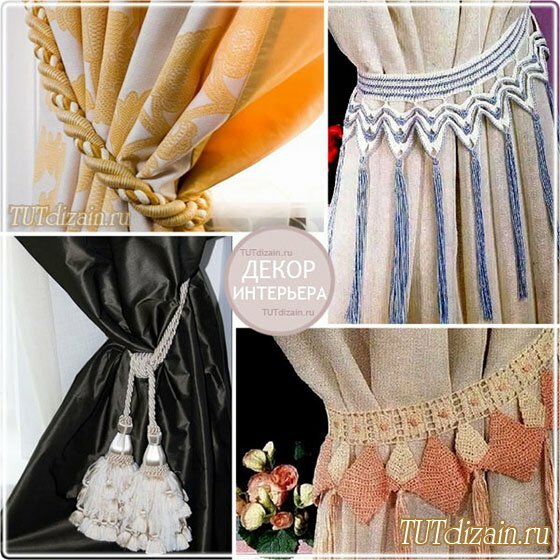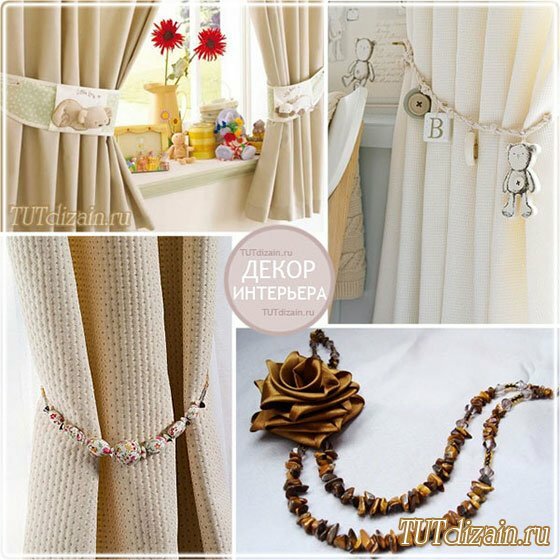 Подхваты способны обновить поднадоевшие шторы. Их функцию могут выполнять кожаные ремешки, веревки с кистями, полосы ткани, тесьма. Им можно придавать форму колец, оформлять их в виде косичек, ракушками, бусинами и бисером. Для оформления детской комнаты отлично подойдут мягкие игрушки, зверюшки. Смотрите подборку идей.