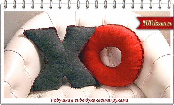 Подушки в данном мастер-классе изготовлены в форме букв «Х» и «О», что собой представляет практически интернациональное сокращение от «объятия и поцелуи». Для придания наиболее гармоничного эффекта, наволочка каждой буквы выполнена из тканей темно-красного и серого цветов, а обшили их контрастными нитями, соответственно – серой и красной.