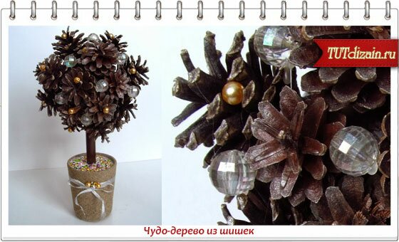 Делать такое деревце можно вместе с детьми. Мы собирали шишки еще летом – дочь отдыхала в санатории, тогда и набрали их для поделок. Но, к сожалению, на деревце их не хватило… Поэтому мы пошли в лес, а там уже снег лежит. Разрыли снег, нашли шишки, а они такие замерзшие, как комочки, и совсем не похожи на распущенные цветочки. Принесли домой, разложили и начали наблюдать, как они начинают раскрывать свои чешуйки, становятся пушистыми и красивыми... ![]()
