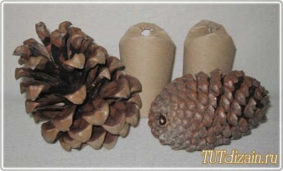 - большие шишки; - бобины от туалетной бумаги; - ватные диски + клей ПВА; - плотный картон; - шнурок; - деревянная шпажка; - клей «Титан»; - масса папье-маше (рецепт здесь); - пластика (полимерная глина); - краски + кисть, блёстки и т.д.