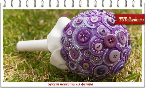 Букет невесты не обязательно делать из живых цветов. В настоящее время свадебный букет можно заказать из любых материалов – из бусин / бисера / пуговиц, из ткани, из бумаги, из винтажных брошек и т.д. Здесь главное чтобы он полностью соответствовал стилистике торжества. Например, букет из джинсы, превосходно впишется в свадебное торжество, где джинсовая ткань является основной (т.е. из нее выполнены различные свадебные аксессуары). Сегодня предлагаем ознакомиться с оригинальной и в тоже время простой идеей изготовления букета невесты из фетра (войлока).